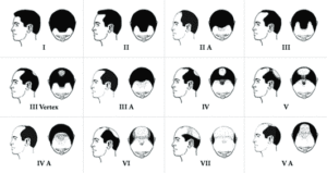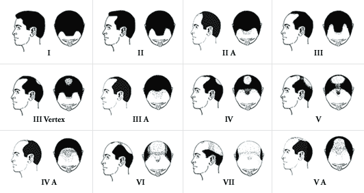 Η πρόοδος της ανδρογενετικής αλωπεκίας κατατάσσεται με βάση διεθνώς αναγνωρισμένες κλίμακες (Male Pattern Hair Loss / Female Pattern Baldness):