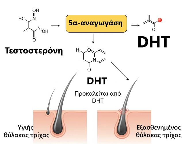 Η τεστοστερόνη, που κυκλοφορεί φυσιολογικά στο αίμα, μετατρέπεται σε DHT με τη δράση του ενζύμου 5-άλφα αναγωγάση.