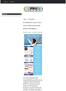 Την Τετάρτη 20 Απριλίου 2016, πραγματοποιήθηκε με μεγάλη επιτυχία, η εκδήλωση ΗΕΑLTH & WELLNESS SECRETS, στο Ecali Club, από την εταιρία First Communications. Συμμετείχαν κορυφαίοι ομιλητές από τον χώρο της Υγείας & της Ευεξίας, οι οποίοι ανέλυσαν τις τελευταίες εξελίξεις στον τομέα τους.