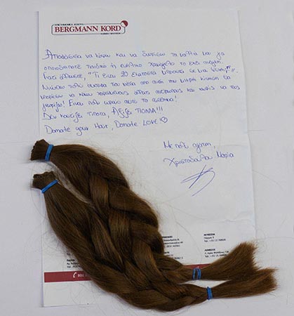 Η παραπάνω φράση αποτελεί απόσπασμα από την επιστολή την οποία παρέδωσε η κυρία Μαρία Χριστοδούλου αμέσως μετά την δωρεά μαλλιών της για τους σκοπούς του “HOPE for HAIR” στο Επιστημονικό Κέντρο της Bergmann Kord στη Λάρισα.