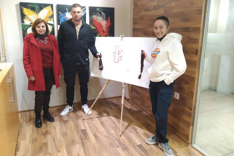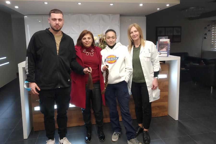 Η Κυρία Μητσανά Βασιλική, εθελόντρια στο Σύλλογο Καρκινοπαθών Λάρισας, συνόδεψε την ανηψιά και τον γιό της στο Επιστημονικό Κέντρο Bergmann Kord Λάρισας, για να προσφέρουν λίγα εκατοστά από τα μαλλάκια τους προκειμένου να κατασκευαστούν περούκες, οι οποίες θα προσφερθούν στους Άπορους, Πάσχοντες Συνανθρώπους μας.