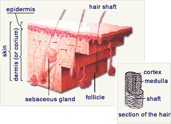 II) Unter der Epidermis, befindet sich die Dermis, die dicker als die erstere ist. Zwischen den beiden steht die Basalmembrane. Hauptsächlicher Bestandteil der Dermis, die auch Lederhaut genannt wird, ist der Kollagen, der die Haut stützt und ihr Festigkeit verleiht. Die Dermis setzt sich auch aus Fett, Tastsinnesorganen, Blutgefäßen, die die Haut und die sich darin befindlichen Haarfollikel ernähren, Nervenfasern, Schweiß- und Talgdrüsen zusammen. Die Haarfollikel reichen bis in die Dermis hinein.