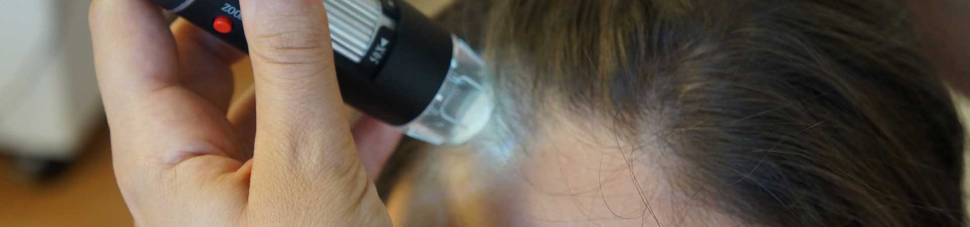 Στη συνέχεια ανιχνεύονται τυχόν δυσλειτουργίες όπως, π.χ. δερματικές παθήσεις, έτσι ώστε να μπορεί να γίνει ουσιαστική και ασφαλής εκτίμηση της μελλοντικής εξέλιξης της τριχόπτωσης. - Τριχοριζόγραμμα: Περιλαμβάνει εξονυχιστική παρατήρηση των τριχών μέσω μικροσκοπίου, με στόχο την καταγραφή του ακριβούς αριθμού των τριχών που βρίσκονται σε αναγενή και καταγενή φάση, ώστε να εντοπιστούν πιθανά προβλήματα στο τριχοθυλάκιο.