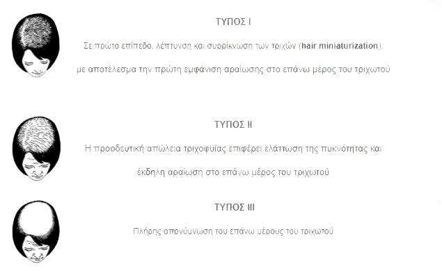 Η πιο κοινή κλινική εικόνα περιλαμβάνει διάχυτη αραίωση στην κορυφή της κεφαλής ή κατά μήκος της χωρίστρας, με διατήρηση της μετωπιαίας γραμμής.